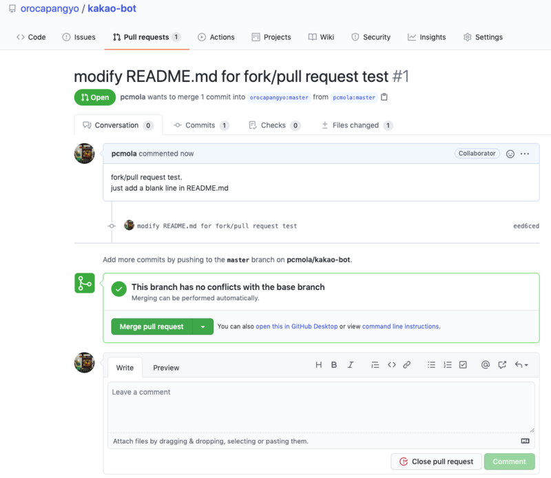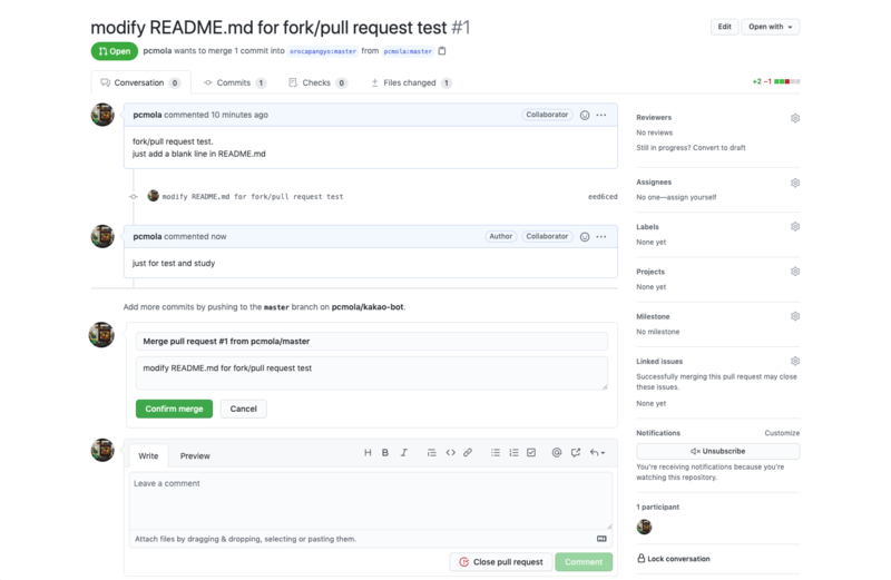 11. Confirm merge ํด๋ฆญํ์ฌ ์์ ๋ ์ฝ๋ ์์ค๋ฅผ ์๋ณธ repo๋ก ๋ณํฉ