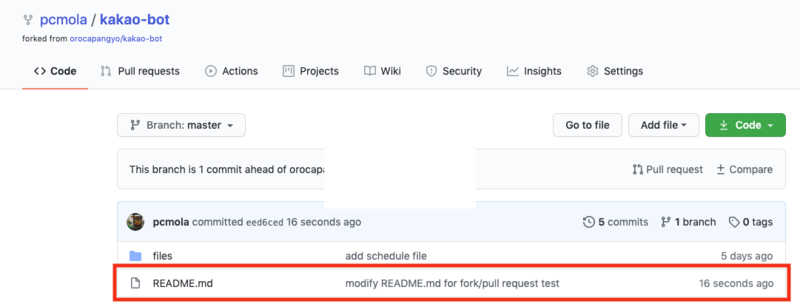6. ๋ด github ๊ณ์ ์ repo์์ Compare ๋ฒํผ ํด๋ฆญํ์ฌ ๋ณ๊ฒฝํ ์ด๋ ฅ์ด ์ ๋ฐ์๋์๋์ง ํ์ธ