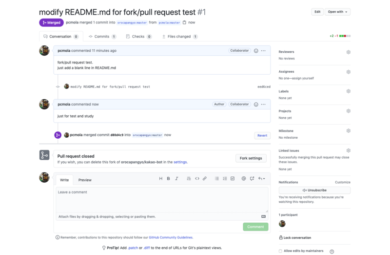 ๐ก forkํ ๋ด github์ ์๊ฒฉ repo์ branch ๋ก push ํด๋น ๋ช ๋ น์ด์์ origin์ ์๊ฒฉ ์ ์ฅ์๋ฅผ ์ค์ ํ ๋ ์ง์ ํ ์ด๋ฆ์ ๋ฐ๋ผ ๋ฌ๋ผ์ง ์ ์๋ค.