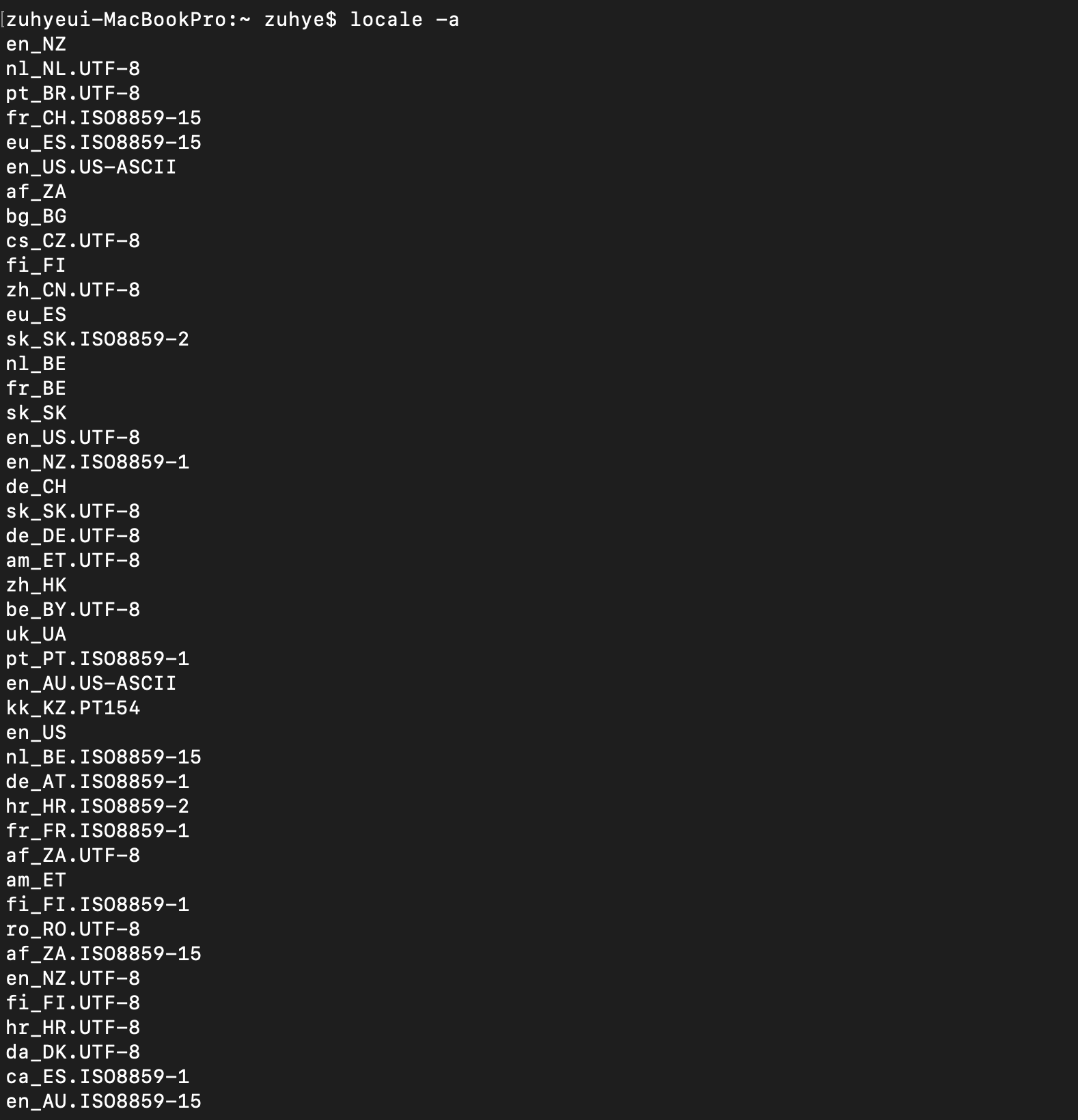 아래와 같이 locale 뒤에 -a를 붙이면 현재 OS에서 사용가능한 모든 로케일을 확인할 수 있다.