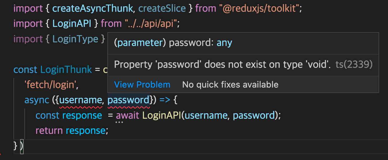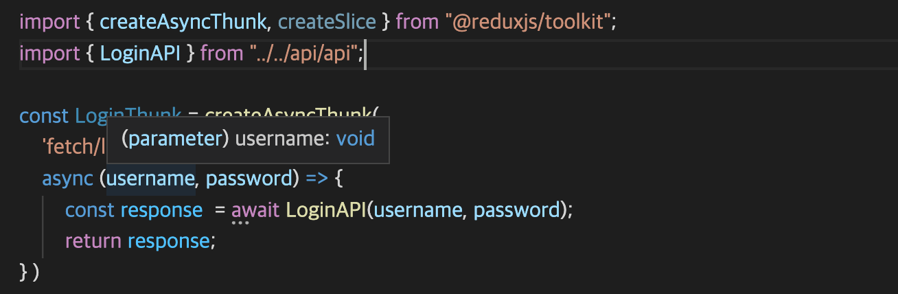 에디터에서 LoginThunk의 콜백함수의 파라미터로 넘기는 username과 password를 자세히 살펴보면 두 인자의 타입이 다르다는 것을 알 수 있다.